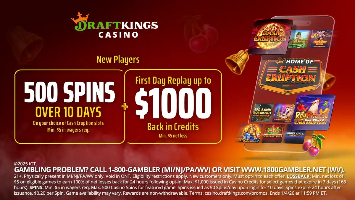 Physically present in MI/NJ/PA/WV only. Void in ONT and where prohibited. Eligibility restrictions apply. New customers only. Must opt-in to each offer. LOSSBACK: Min. net loss of $5 on eligible games to earn 100% of net losses back for 24 hours following opt-in. Max. $1,000 issued in Casino Credits for select games that expire in 7 days (168 hours). SPINS: Min. $5 in wagers req. Max. 500 Casino Spins for featured game. Spins issued as 50 Spins/day upon login for 10 days. Spins expire 24 hours after issuance. $0.20 per Spin. Game availability may vary. Rewards are non-withdrawable. Terms: casino.draftkings.com/promos. Ends 1/4/26 at 11:59 PM ET.